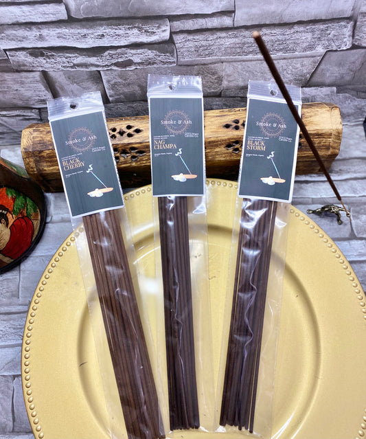 Transform your space with the soulful aroma of Smoke & Ash—a curated line of handcrafted incense sticks designed to elevate your atmosphere. Each 11" stick burns for up to an hour, releasing rich, phthalate-free fragrance made from the highest quality ingredients. Freshly blended in small batches, our incense is made daily to ensure purity, potency, and a truly immersive experience.